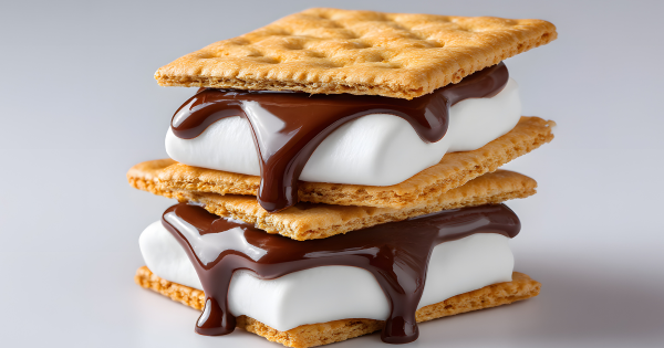 スモアは、マシュマロを火であぶってトロトロに溶かし、そこにチョコレートを添えてクラッカー(主にグラハムクラッカー)で挟むだけの、非常にシンプルなお菓子です。火の熱でマシュマロがとろけ、チョコレートが程よく溶け合うことで、濃厚な甘さとサクサク食感が一体となります。