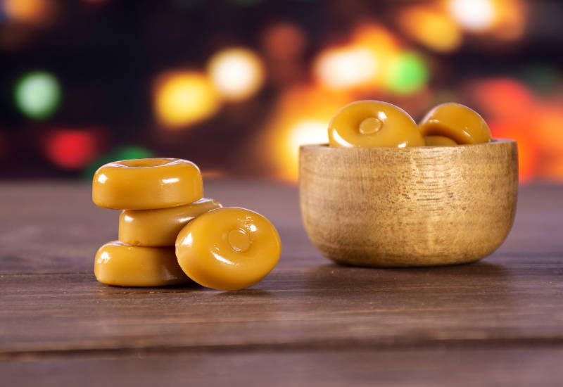 キャラメルキャンディーは、クリームキャラメルやミルクキャラメルとも呼ばれ、牛乳やクリーム、バター、香料などを加えて作られるソフトで歯ごたえのあるキャンディーです。砂糖は244~248°F(約118~120℃)の温度まで加熱されます。キャラメルソースは、熱したキャラメルに生クリーム、牛乳、水を加えて作られます。