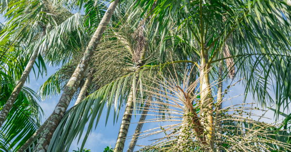 アサイーパームは、南米の熱帯雨林に自生する常緑の高木で、高さは15〜20mほどに成長します。幹は細長く、直径は20cm前後と比較的スリムで、群生して育つことが多いのも特徴です。