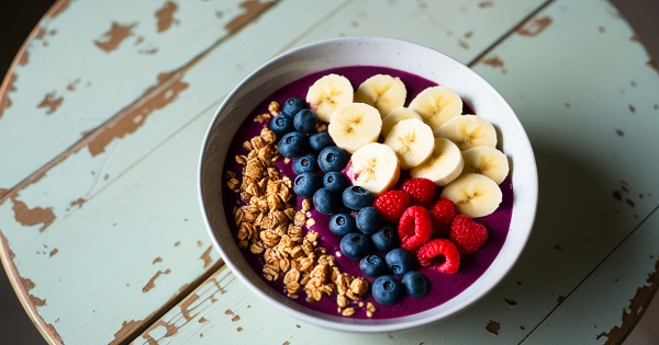 アサイーの食べ方として代表的なのが「アサイーボウル」です。フルーツやグラノーラを組み合わせることで、栄養も彩りも豊かな一品になります。