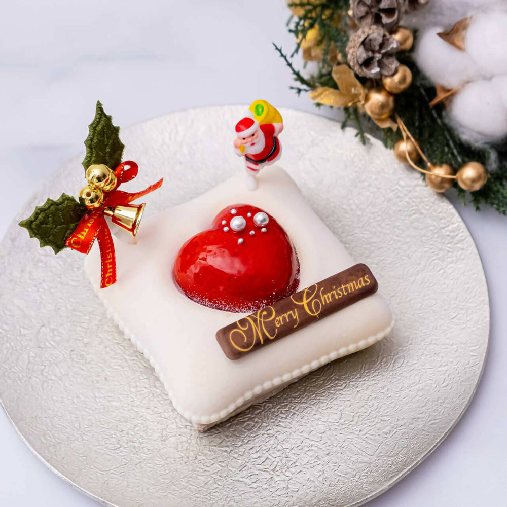 - 2人の聖夜を飾る、優しいクッションの上に真っ赤なハートのクリスマスデコレーションケーキです。