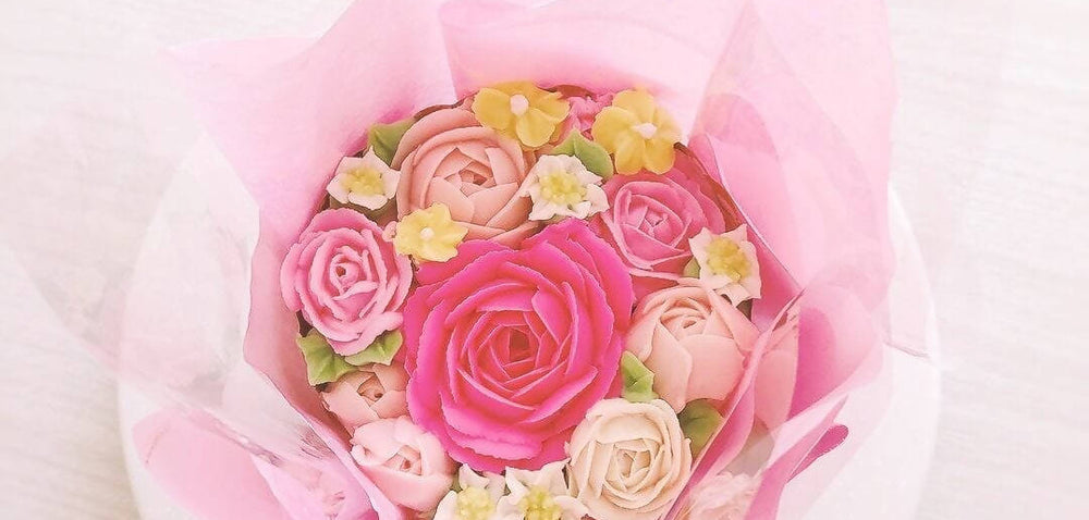 本物の花束のような感動を贈ろう。ピンクとパープルのセットでお祝いを彩るカップケーキ。合成着色料...