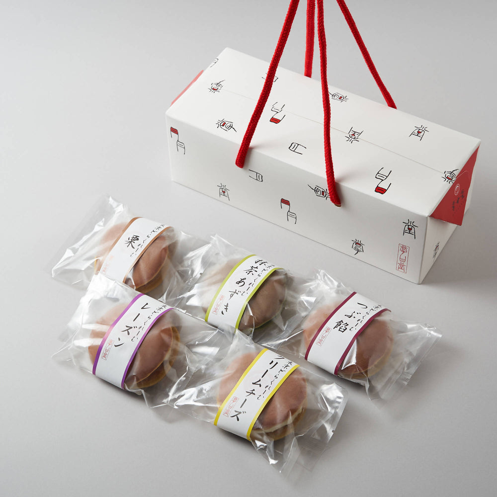 - 5種類の素材(つぶ餡・抹茶・栗・レーズン・クリームチーズ)を生クリームに混ぜた生どら焼きです。