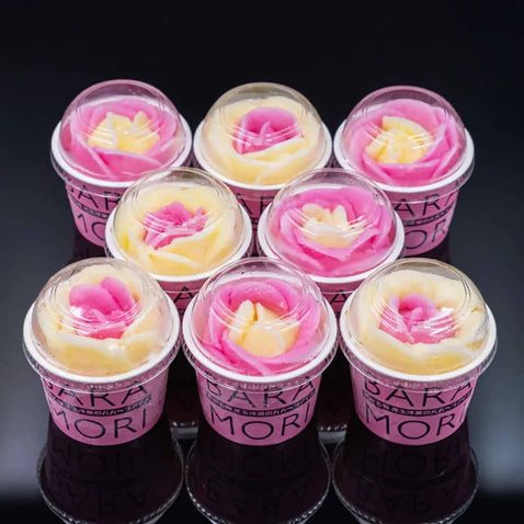 まるでバラの花のように象られたその見た目!ピンクと黄色のコントラストがとってもきれいなアイスです。シャーベット状のアイスはしゃりしゃりしていて、世代を問わず愛されるシンプルな味わいとなっています。ババヘラアイスは、タッパー、バラ 盛り カップなど様々なタイプで販売しています。