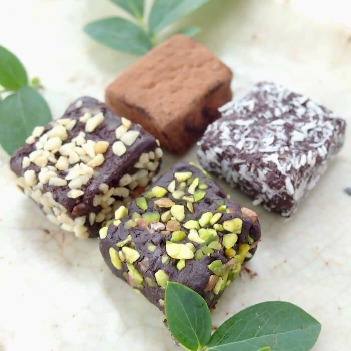 オーガニックココアパウダーでコーティングしたもの、オーガニックココナッツ、無添加ピスタチオ、無添加ヘーゼルナッツをを練り込んだものを詰め合わせました♪