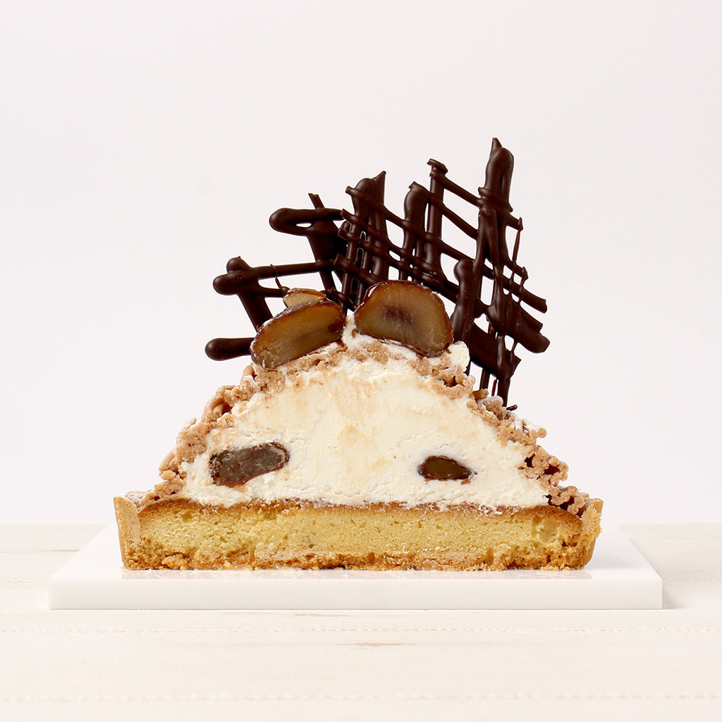 サクサクのタルトの上、フランス産のマロンピューレとスペイン産のマロンクリームとバターで作った、マロンクリームの中に生クリームと渋川栗がゴロゴロ入った贅沢なケーキです。