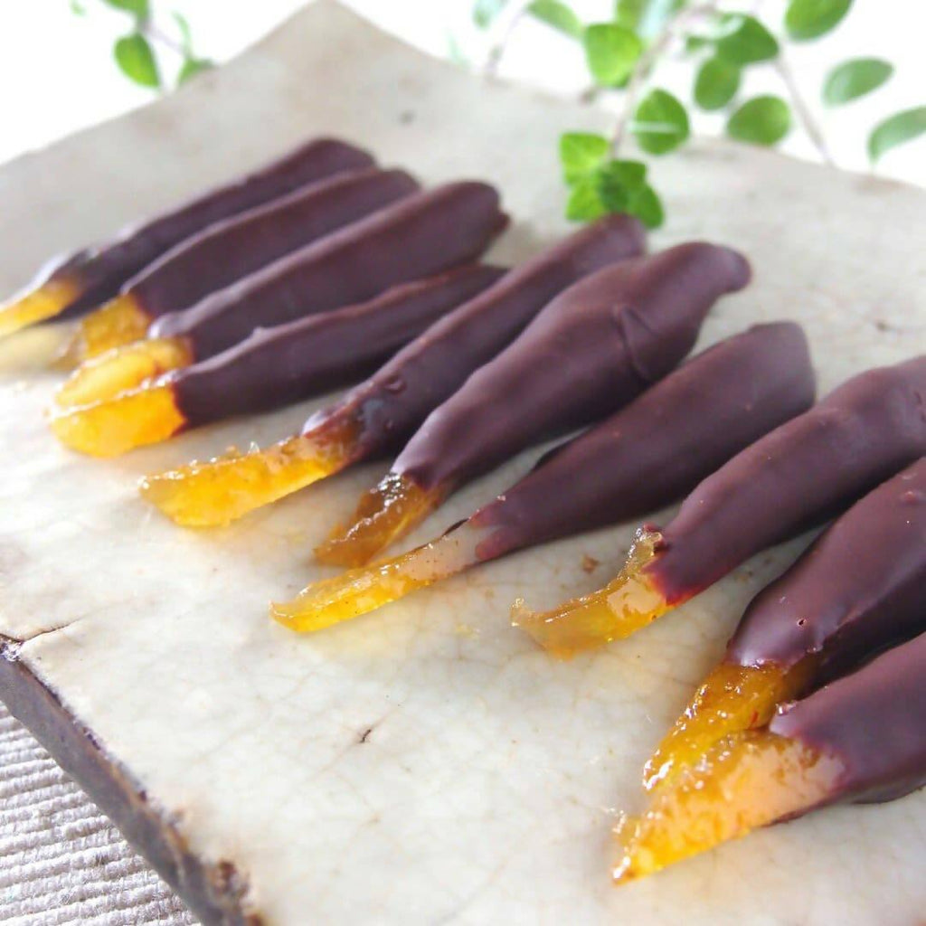 柑橘類の果皮(ピール)を砂糖漬けにして、チョコレートで包んだお菓子です。オレンジピール チョコ コーティングが最も一般的ですが、レモンやグレープフルーツなどのピールを使ったものもあります。
