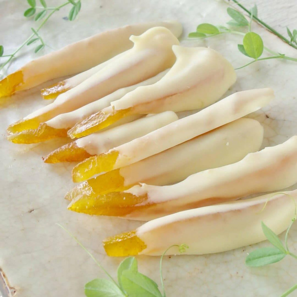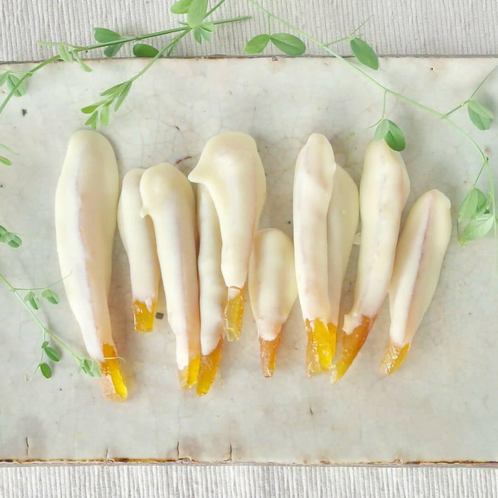 添加物不使用のオーガニッククーベルホワイトチョコをテンパリングして1本1本手で丁寧に作った手作りピールチョコです。