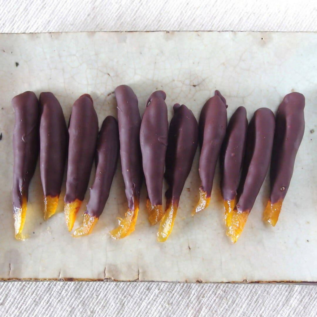 宮崎綾町産自然栽培日向夏の皮をオーガニック粗糖で長時間かけて煮込んで作ったピールに、添加物不使用のオーガニッククーベルビターチョコをテンパリングして1本1本手で丁寧に作った手作りピールチョコです。